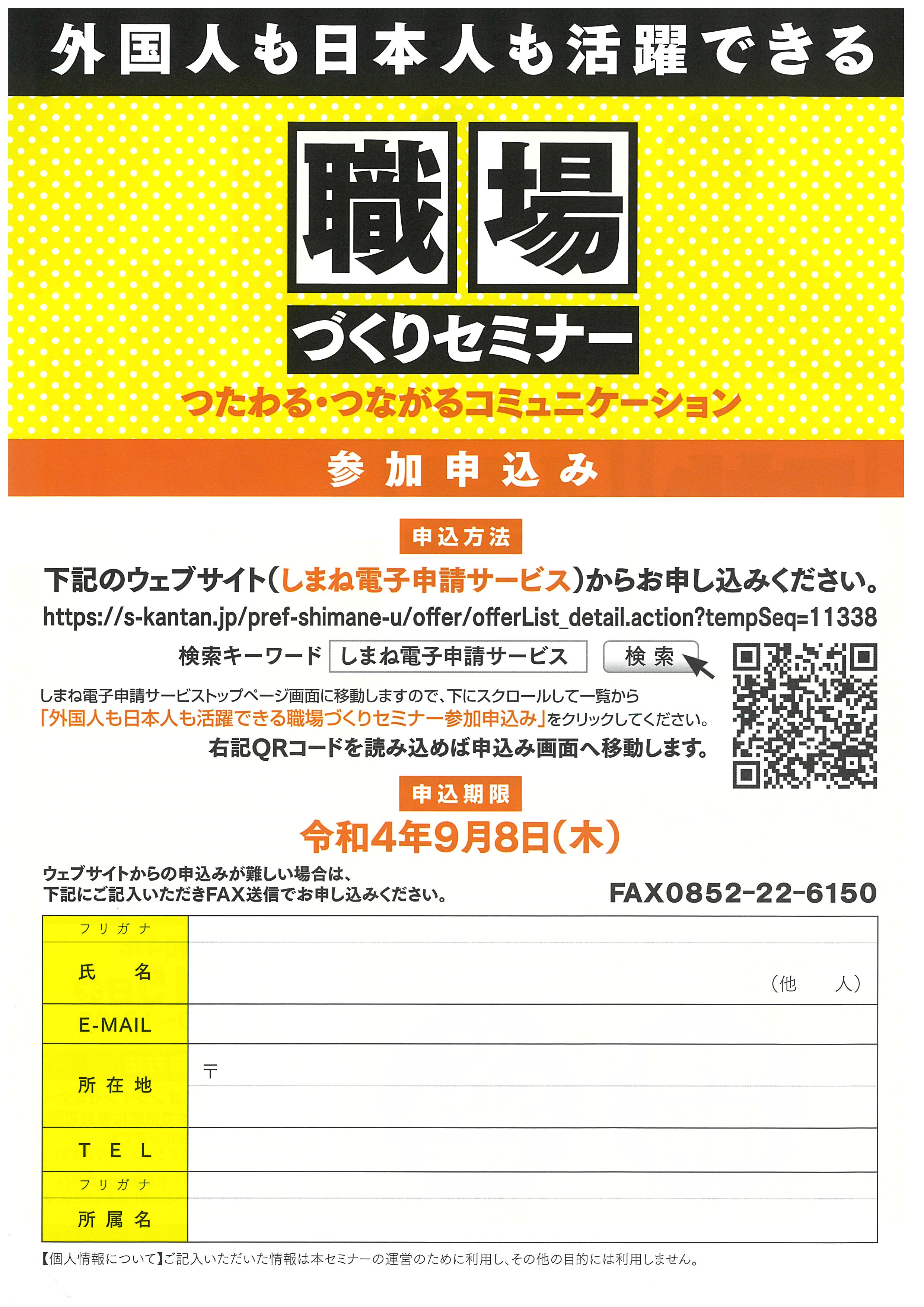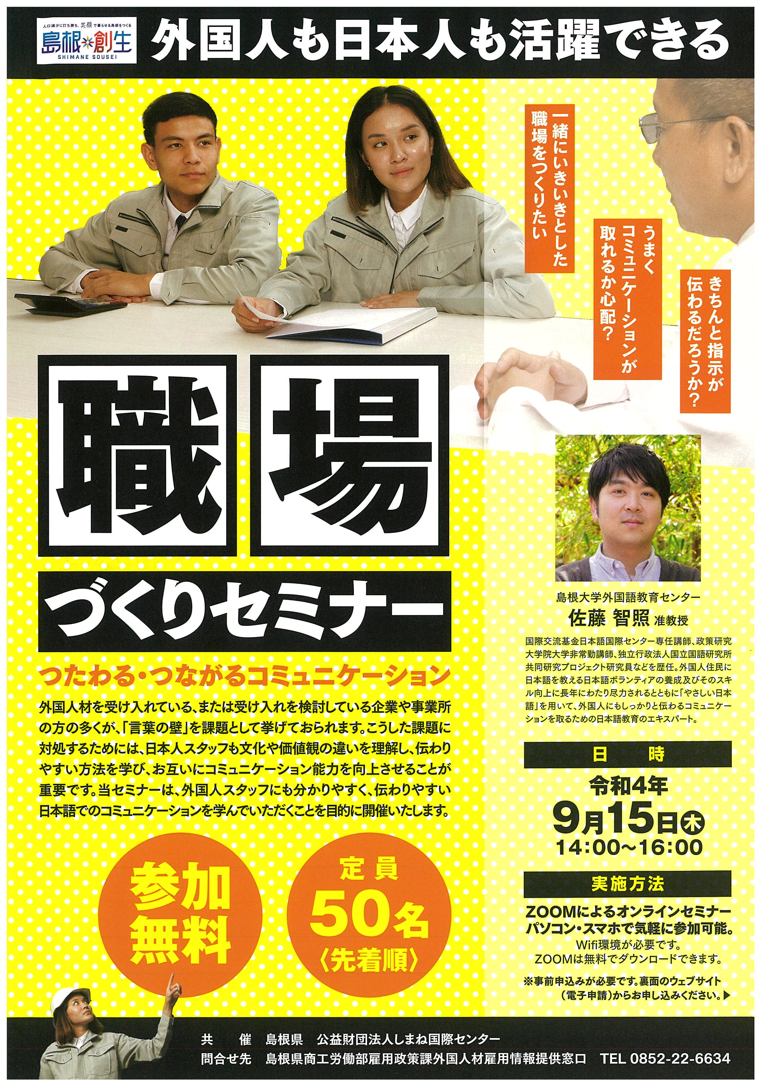 来る9月15日(木)の14:00~16:00まで、島根県ならびに公益財団法人しまね国際センター共催で、外国人も日本人も活躍できる「職場づくりセミナー」が開催されます。